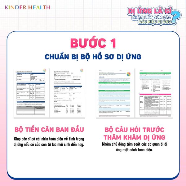 Bộ câu hỏi trước thăm khám dị ứng: những băn khoăn của ba mẹ về vấn đề bệnh lý của con, ba mẹ có biết việc con có cơ địa dị ứng hay không? Ba có cảm thấy bệnh lý hiện tại của con làm ảnh hưởng tới chất lượng cuộc sống của con và gia đình, mức độ ảnh hưởng như thế nào? Ba mẹ đã làm gì có thể kiểm soát bệnh lý tái đi tái lại của con